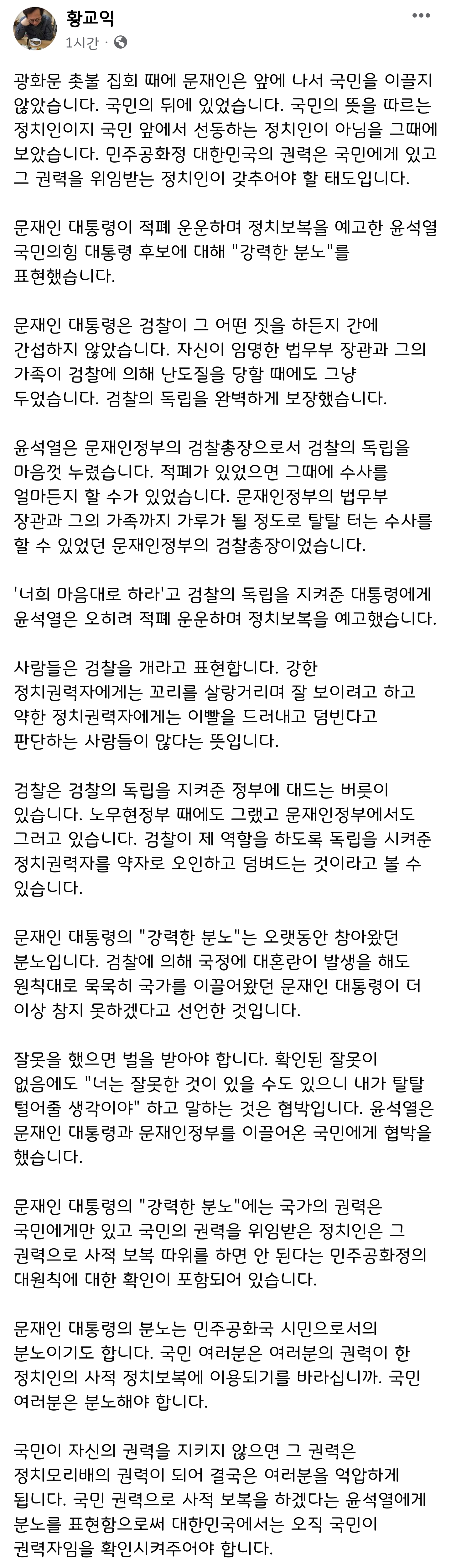 윤석열은 왜 문재인 대통령을 협박 했나? 화가난 문재인 대통령 - 황교익 페북