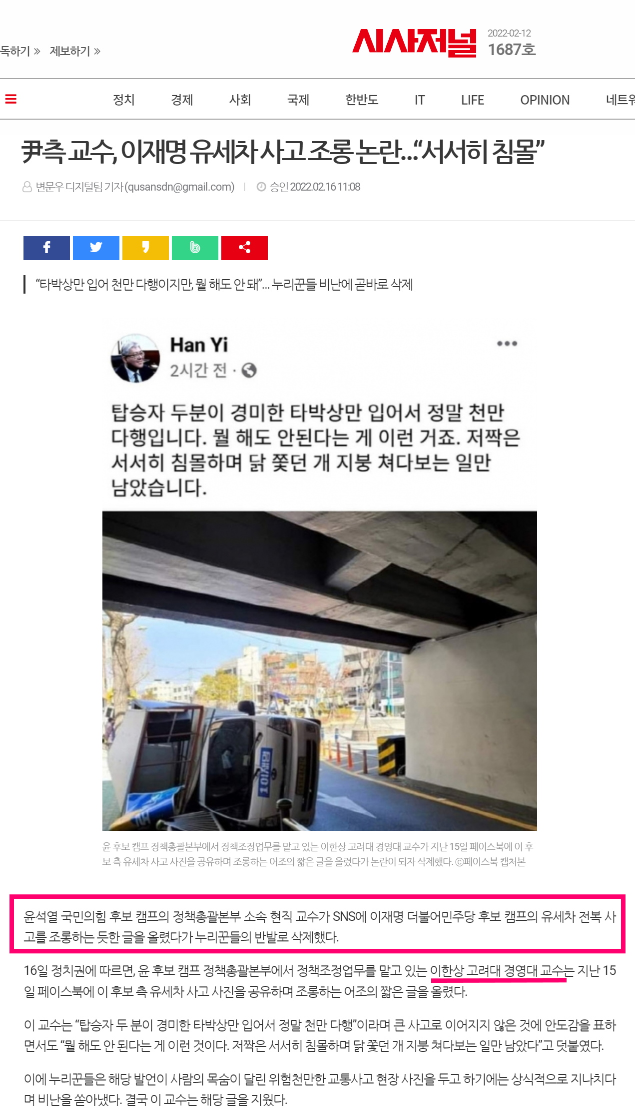 (기사링크) 尹측 교수, 이재명 유세차 사고 조롱 논란…“서서히 침몰”