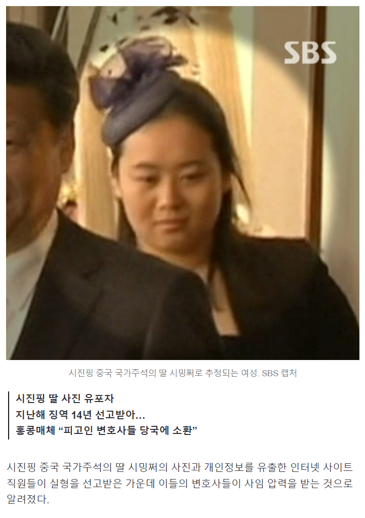 시진핑 딸 사진 유포자 지난해 징역 14년 선고받아… 홍콩매체 “피고인 변호사들 당국에 소환” 시진핑 중국 국가주석의 딸 시밍쩌의 사진과 개인정보를 유출한 인터넷 사이트 직원들이 실형