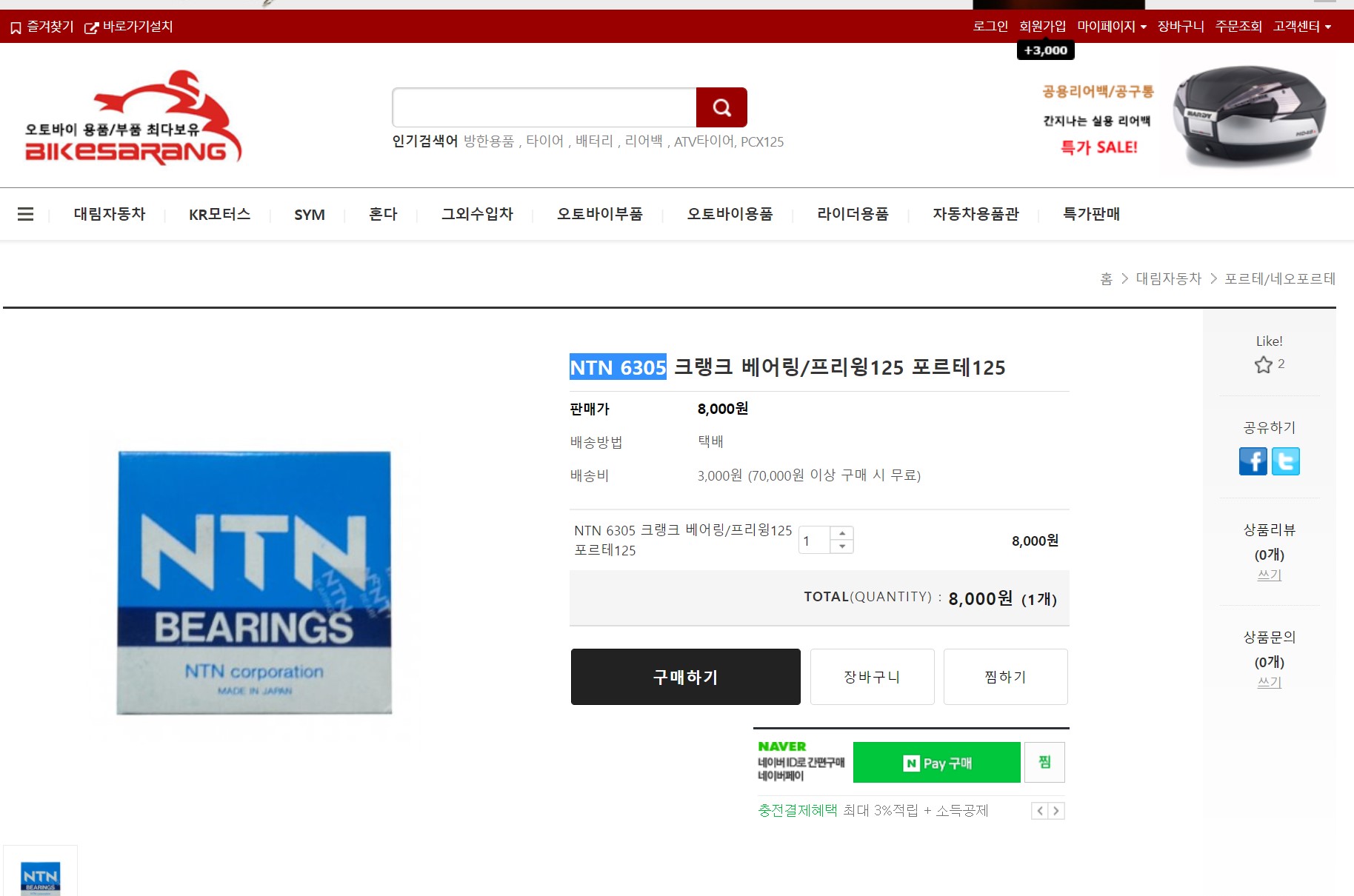 NTN 6305 크랭크 베어링/프리윙125 포르테125