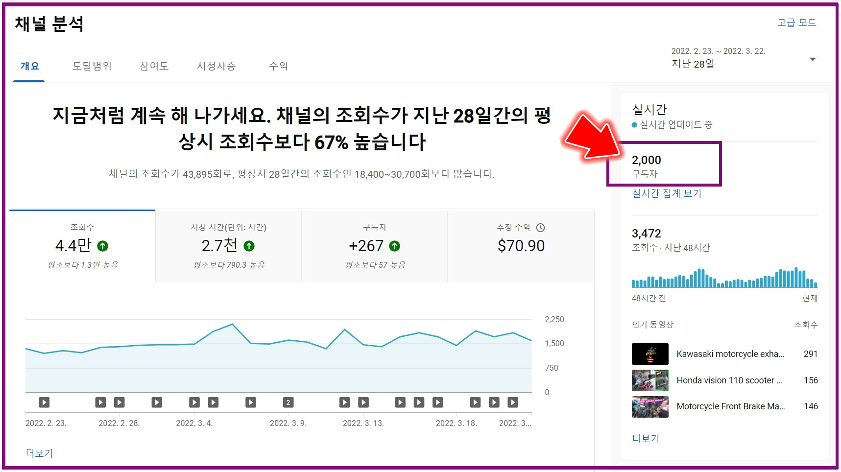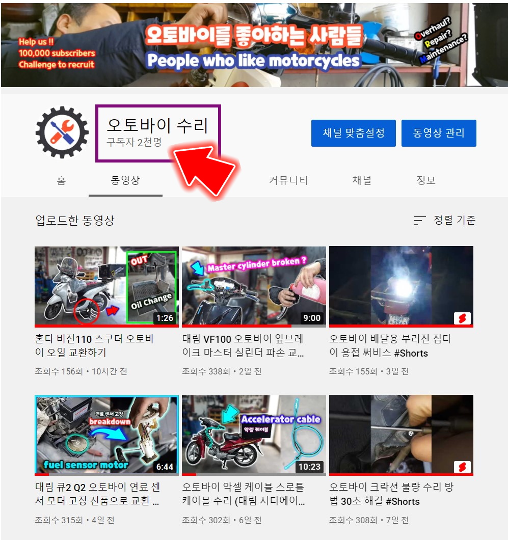 오토바이 수리 유튜브 채널 오늘 구독자 2000명 달성 ㅋ