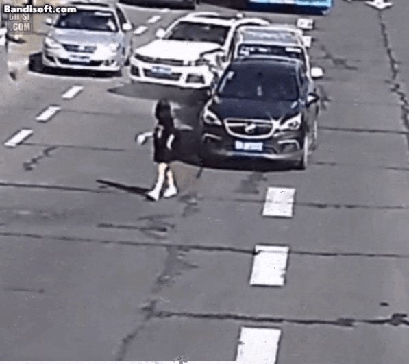 중국 도로에서 스마트폰 하는 여학생의 무개념 도로횡단