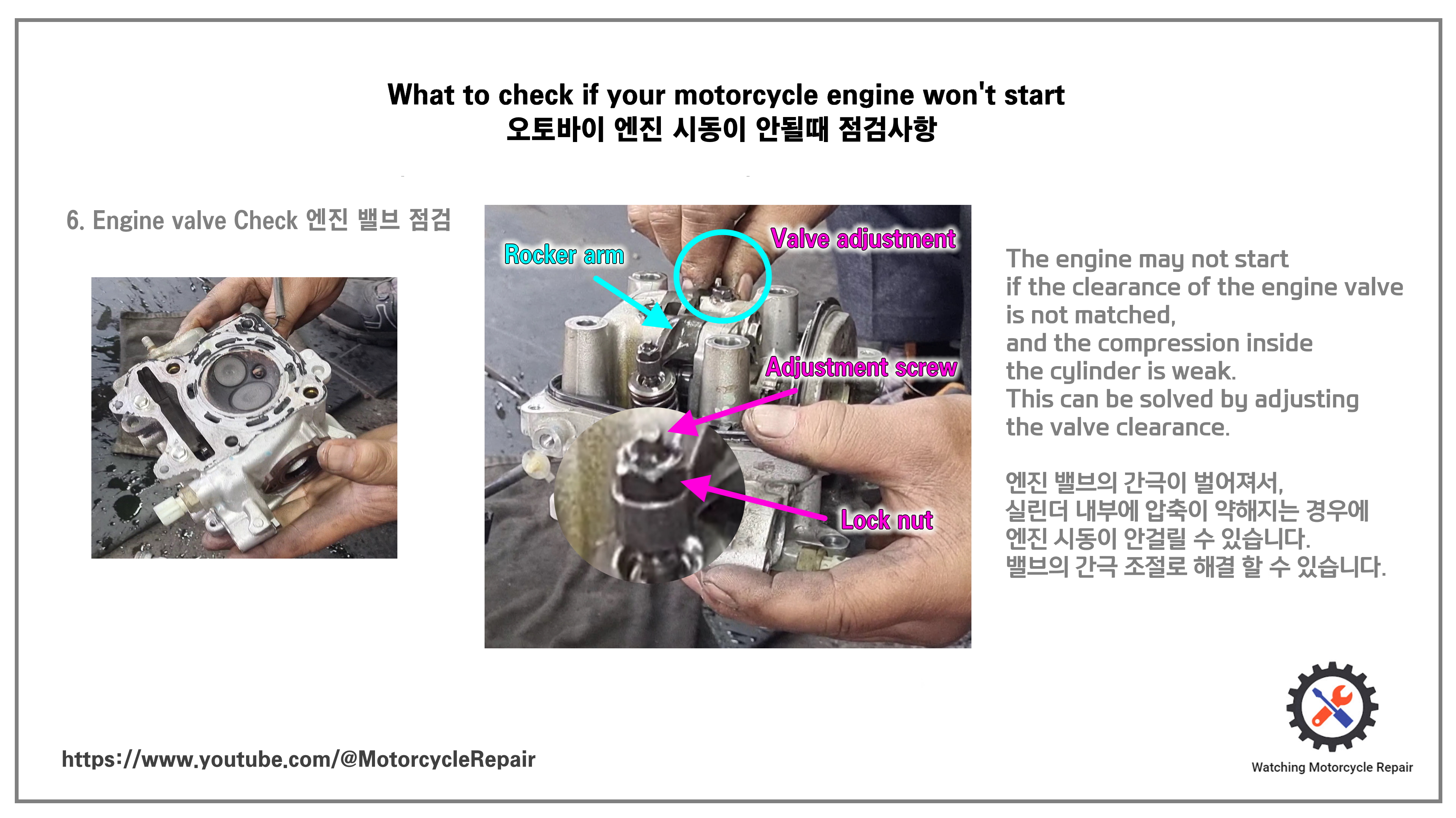 엔진 밸브의 간극이 벌어져서, 실린더 내부에 압축이 약해지는 경우에 엔진 시동이 안걸릴 수 있습니다.