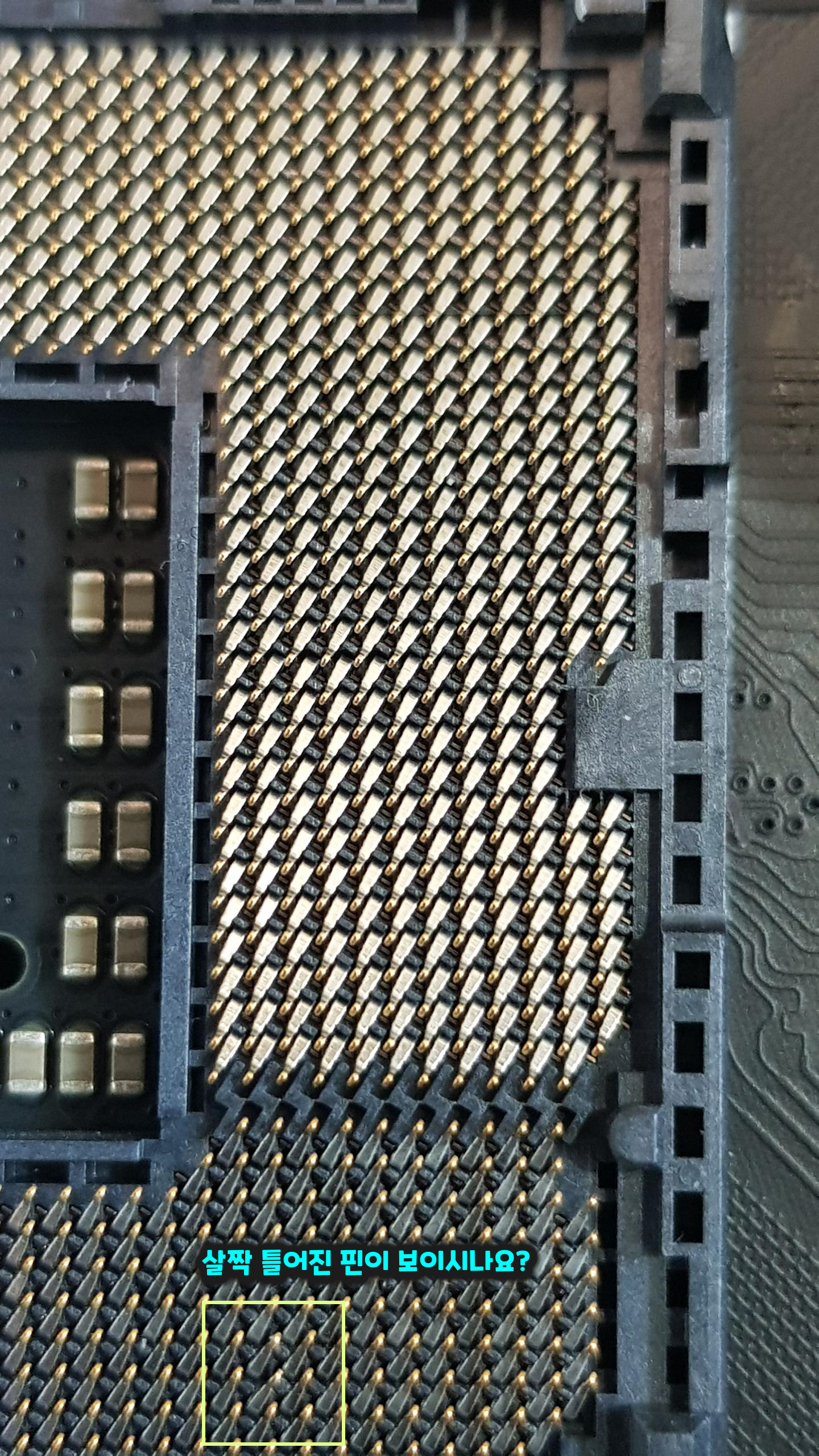 아주 살작...기울어진 CPU 소켓안의 핀이다. (인텔 보드)