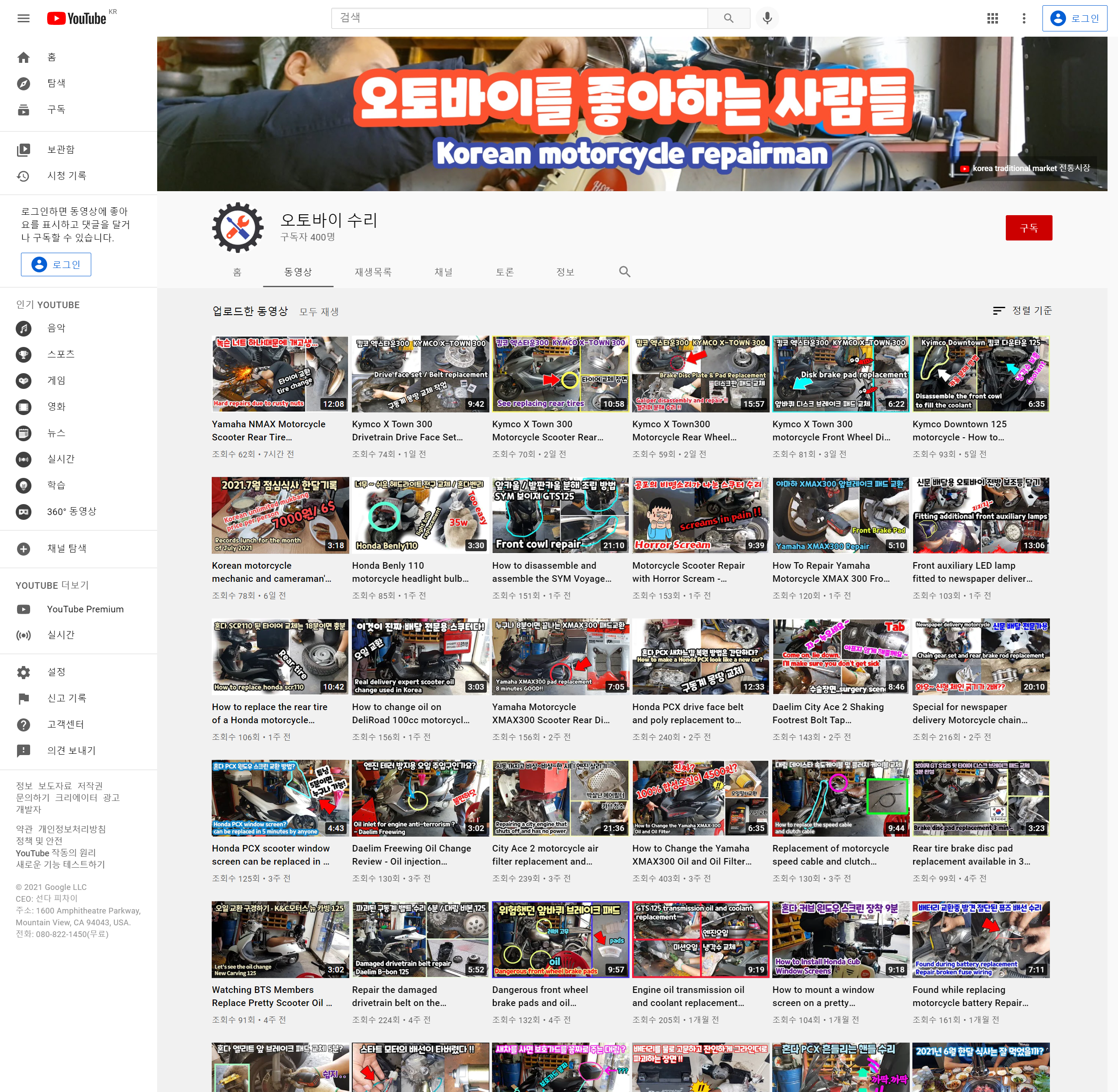 오토바이 수리 유튜브 채널 구독자 400명 달성 기록