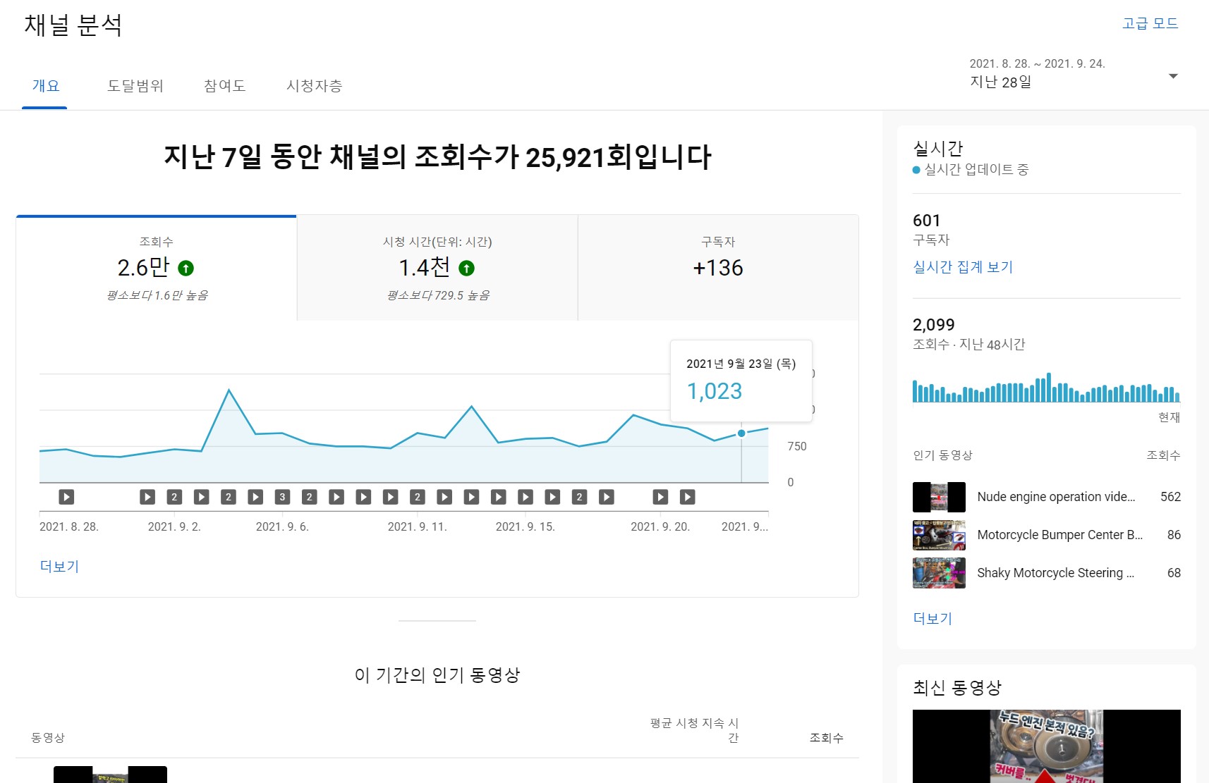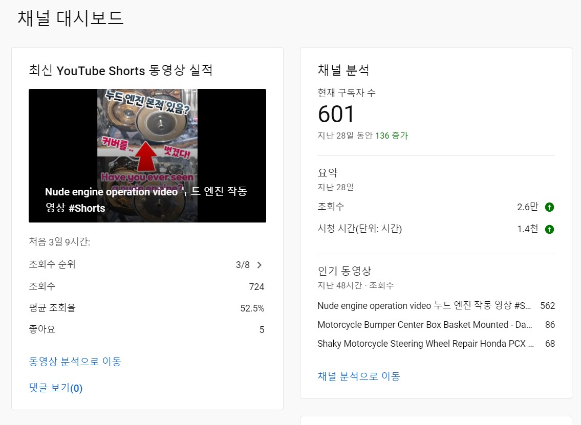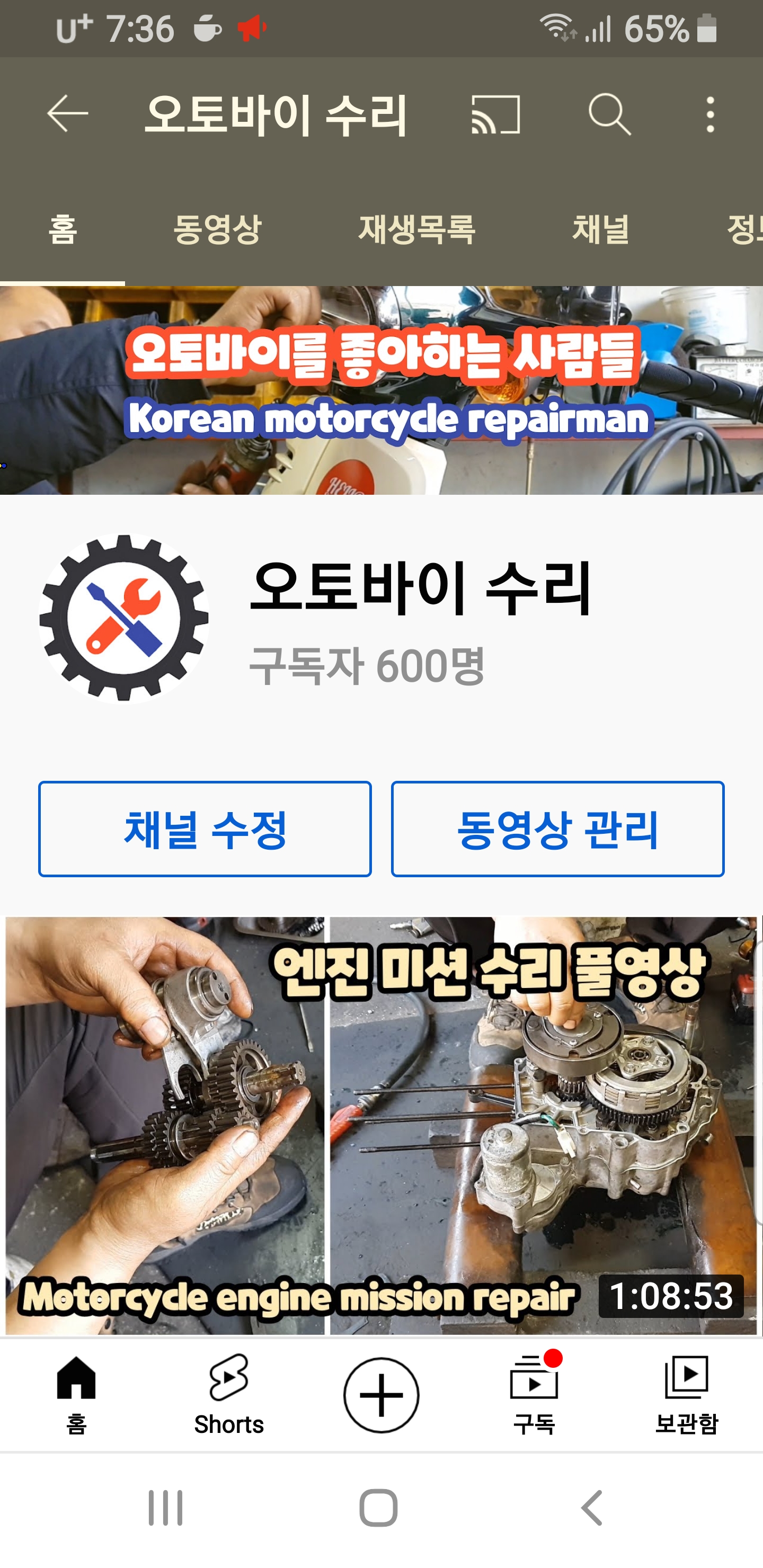 오토바이 수리 유튜브 채널 구독자 601명 달성 기록 저장