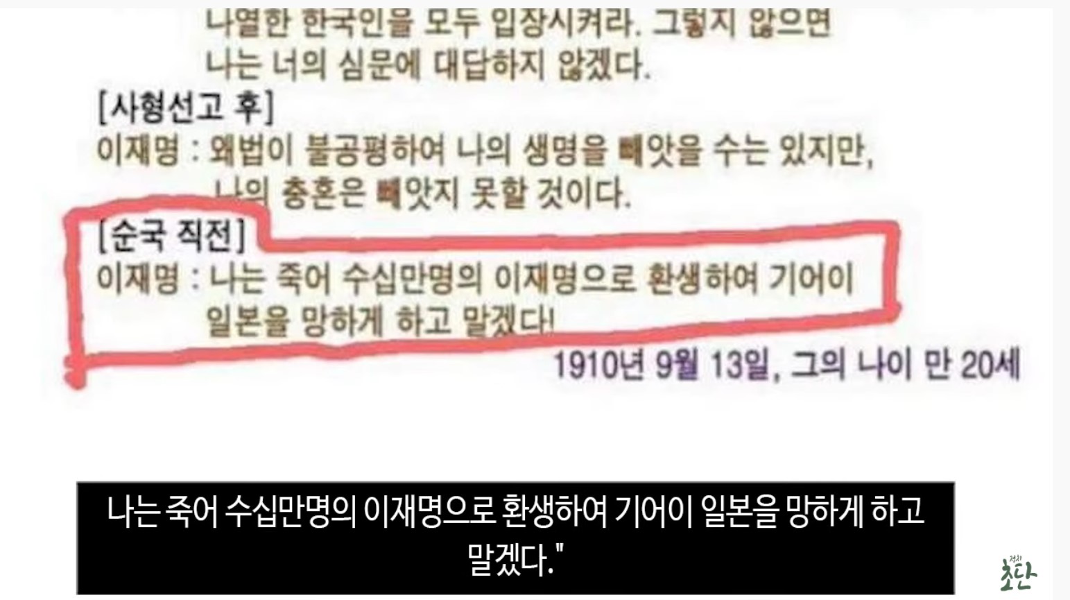"이 일에 찬성한 사람은 2000만 민족이다. 왜법(쪽바리 법)이 불평하여 나의 생명을 빼앗기는 하나