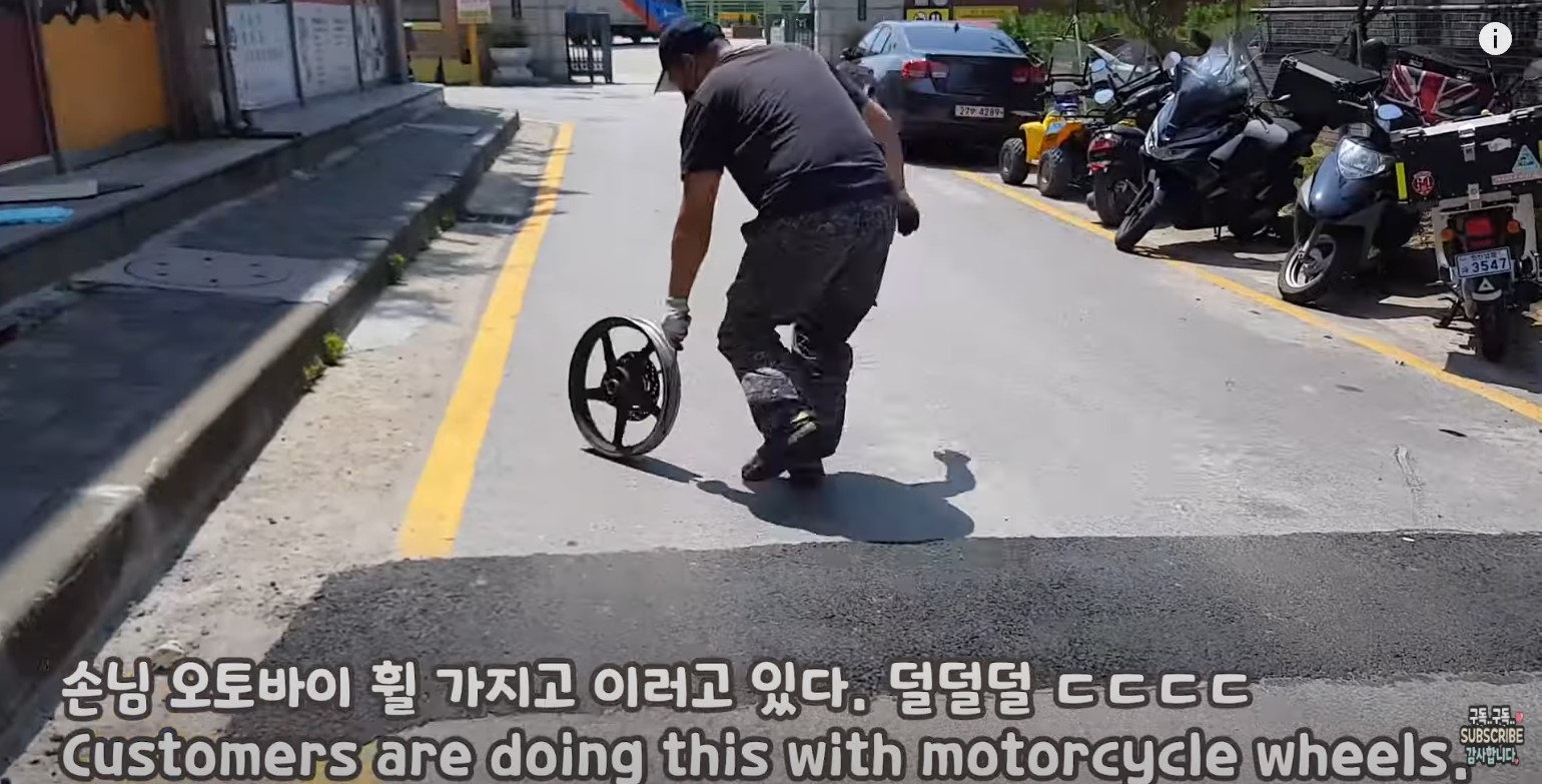 휠을 가지고 굴렁쇠를 굴리는 사장님..ㅋㅋㅋ