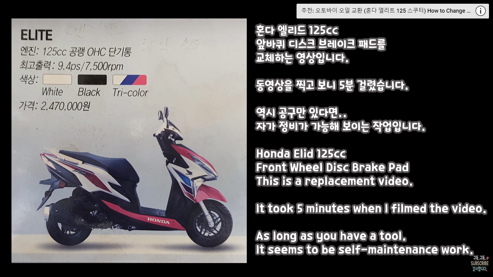 오토바이 앞 브레이크 패드 교체 5분이면 충분하다 - 혼다 엘리트 125cc 스쿠터 Replacing Front Brake Pads on Motorcycle in 5 Minutes - Honda Elite 125cc Scooter