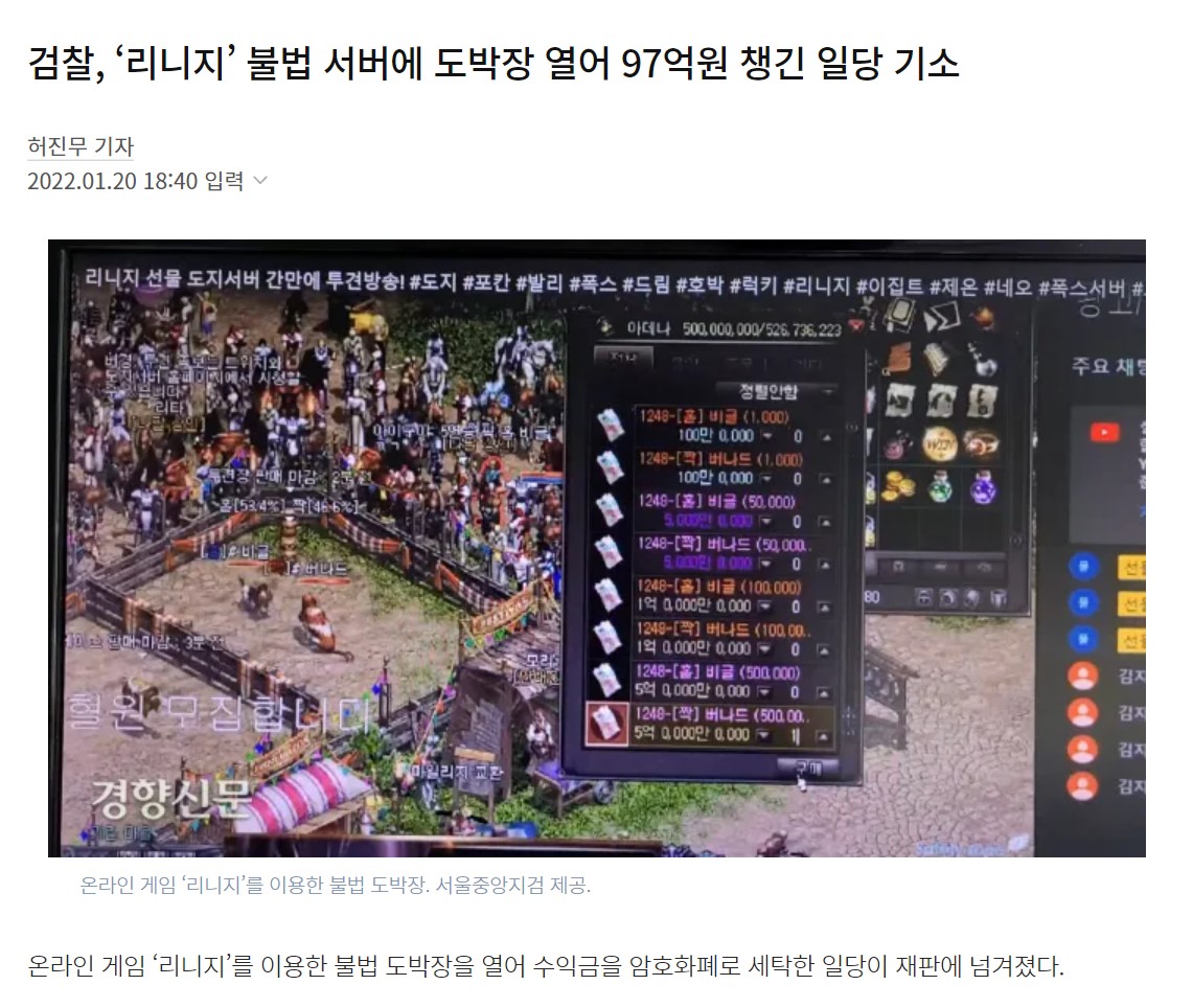 리니지 게임 투견 도박장 운영해서 97억 챙긴 일당 기소 ㄷㄷㄷ