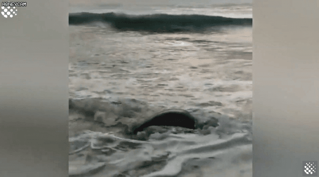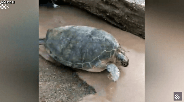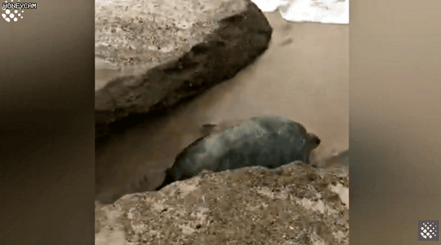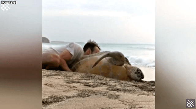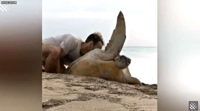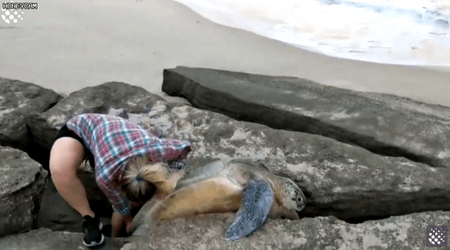 해변의 바위돌 사이에 끼어서 죽음에 직면한 거북이를 구해준 커플이 있다.