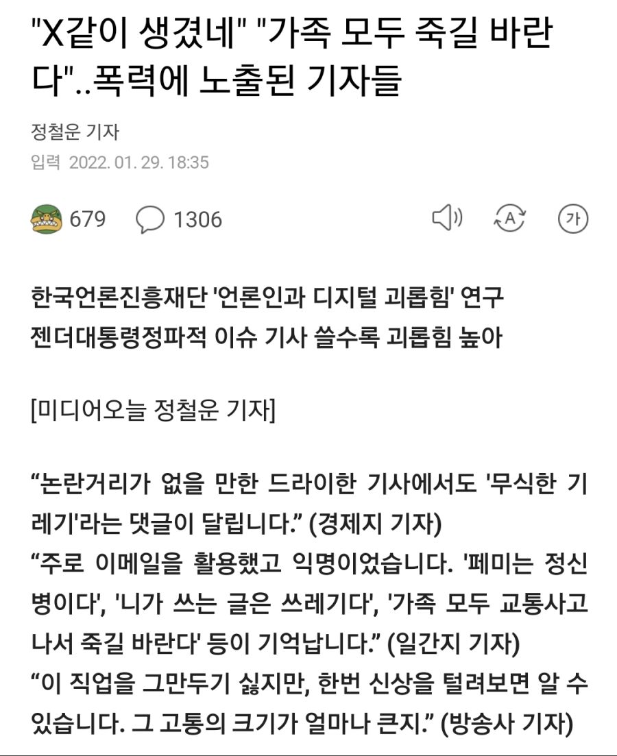 한국언론진흥재단 '언론인과 디지털 괴롭힘' 연구 젠더대통령정파적 이슈 기사 쓸수록 괴롭힘 높아 [미디어오늘 ] “논란거리가 없을 만한 드라이한 기사에서도 '무식한 기레기'라는 댓글이 달