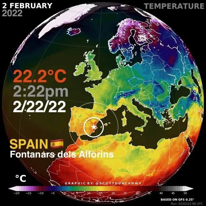 스페인에서 2022년 2월 2일 22시 22분 22초에 기온 22.2°C 습도 22%를 기록함
