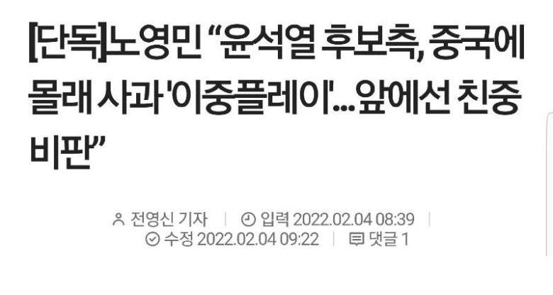 노영민 “윤석열 ‘반중’ 발언 뒤 몰래 사과성 해명”…윤 “지어낸 말”