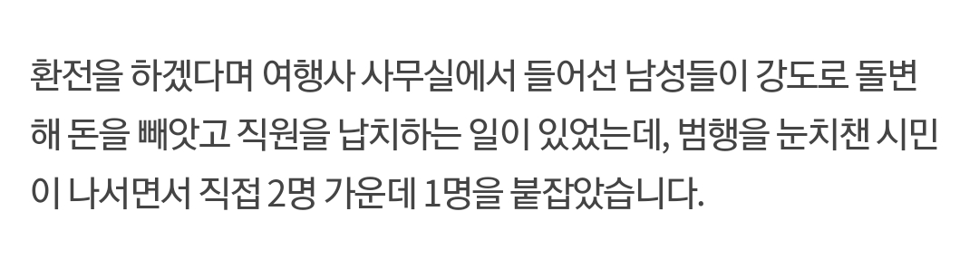 환전을 하겠다며 여행사 사무실에서 들어선 남성들이 강도로 돌변해 돈을 빼앗고 직원을 납치하는 일이 있었는데, 범행을 눈치챈 시민이 나서면서 직접 2명 가운데 1명을 붙잡았습니다.