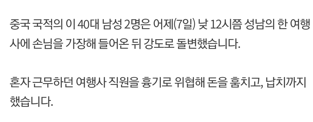 손님 가장한 중국인 2명, 강도로 돌변해 납치까지