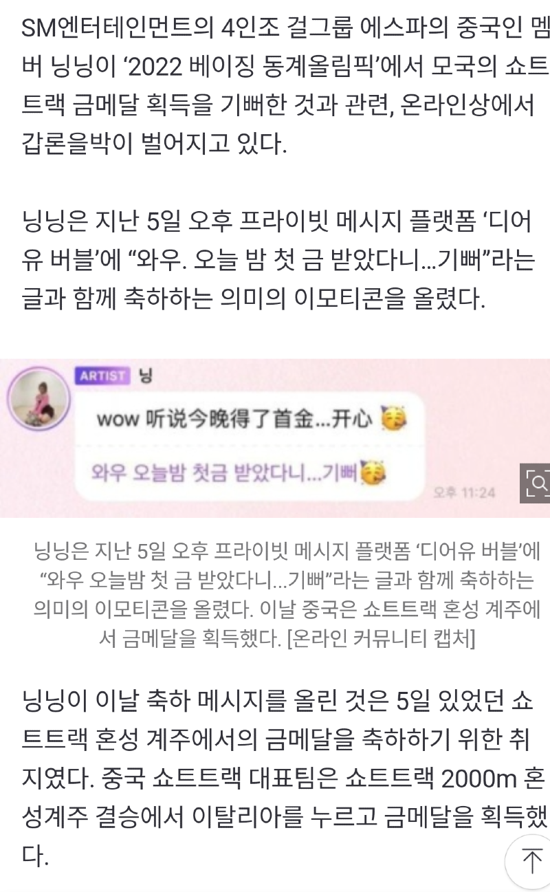 이 시국에..중국인 걸그룹 에스파 닝닝 "쇼트트렉 중국 금매달 기뻐" ㅋㅋㅋㅋ(한국인에게 염장 지르는 ㅋㅋ)