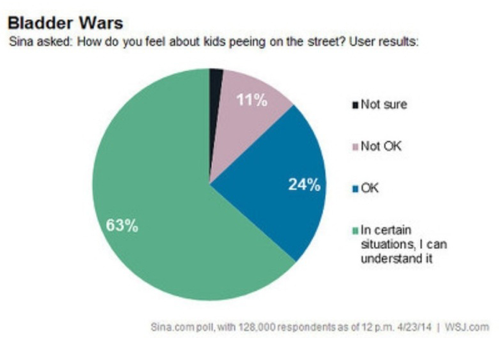 노상배변 문제는 결국 중국에서도 논란이 되었고 신화통신에서 중국인 12만 8천명을 상대로 여론조사를 실시하게 되었는데.... 87%의 중국 사람은 아이들의 노상 배변에 대해 문제가 없다고 생각하는것으로 나와서 큰 충격을 주었다.